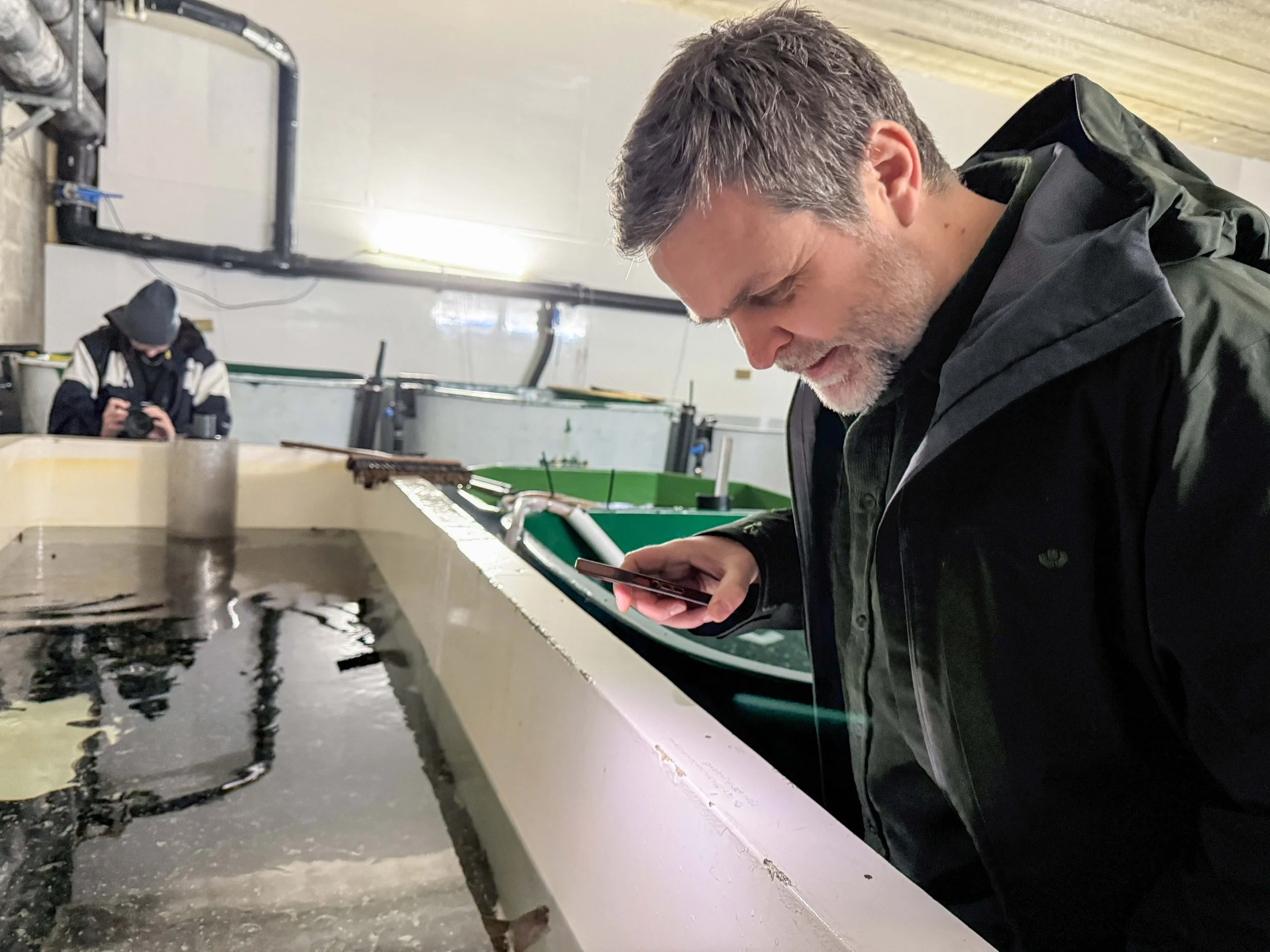 Trond Skjæveland fra Sør-fondet inspiserer kveiteproduksjonen hos Trond Rafoss i Landbasert Akvakultur Norge AS.